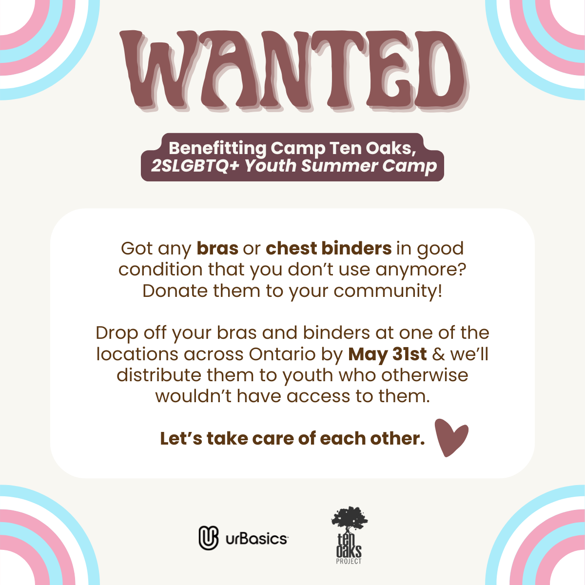 That’s how the 2024 Bra & Binder Drive came to be. Three loving mothers of trans kids led the project which benefited Camp Ten Oaks, a sleep-away camp in Ottawa for kids and youth ages 8 to 17 who are part of the 2SLGBTQIA+ community.